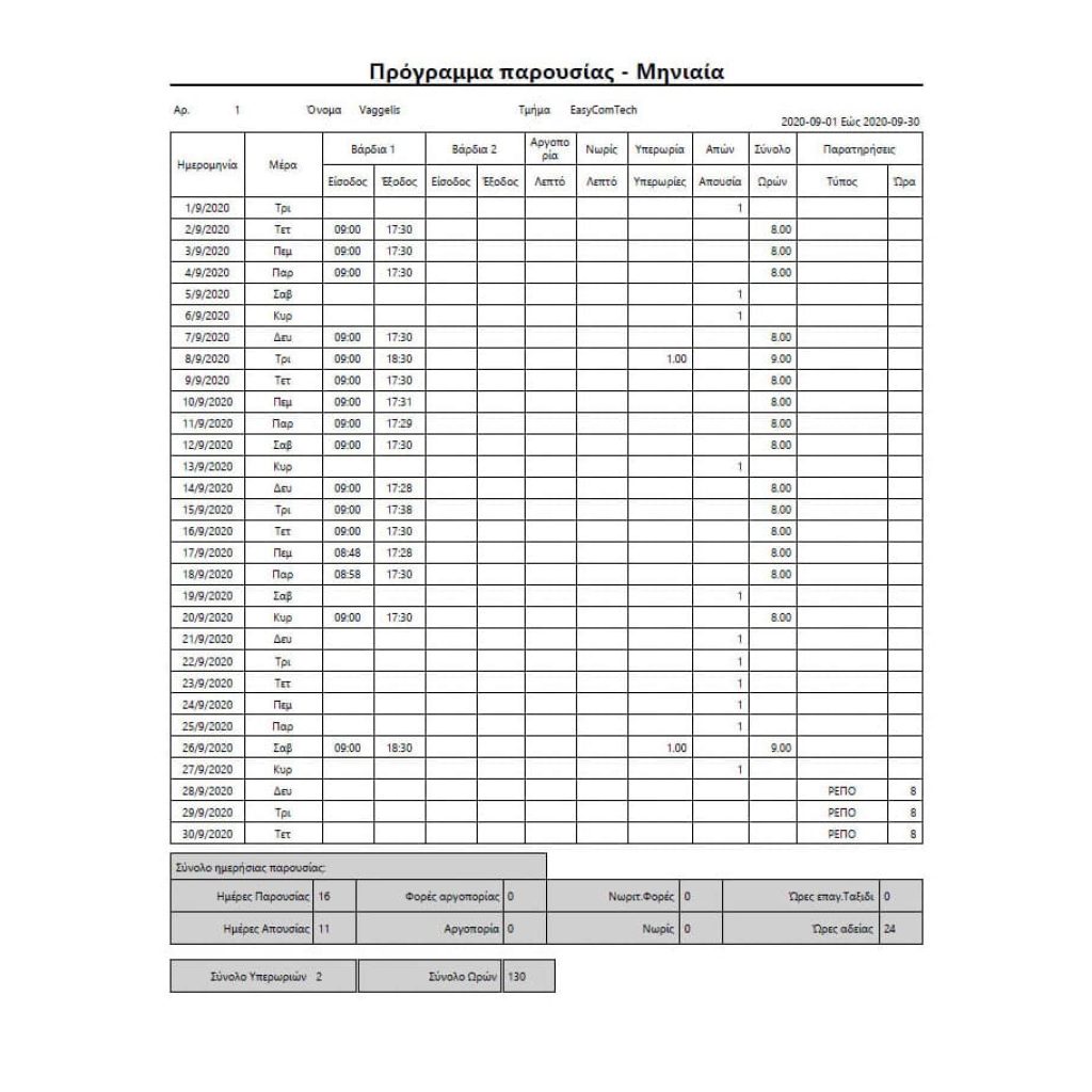 • Μηνιαία εκτύπωση ωρών προσέλευσης και απουσιών.
